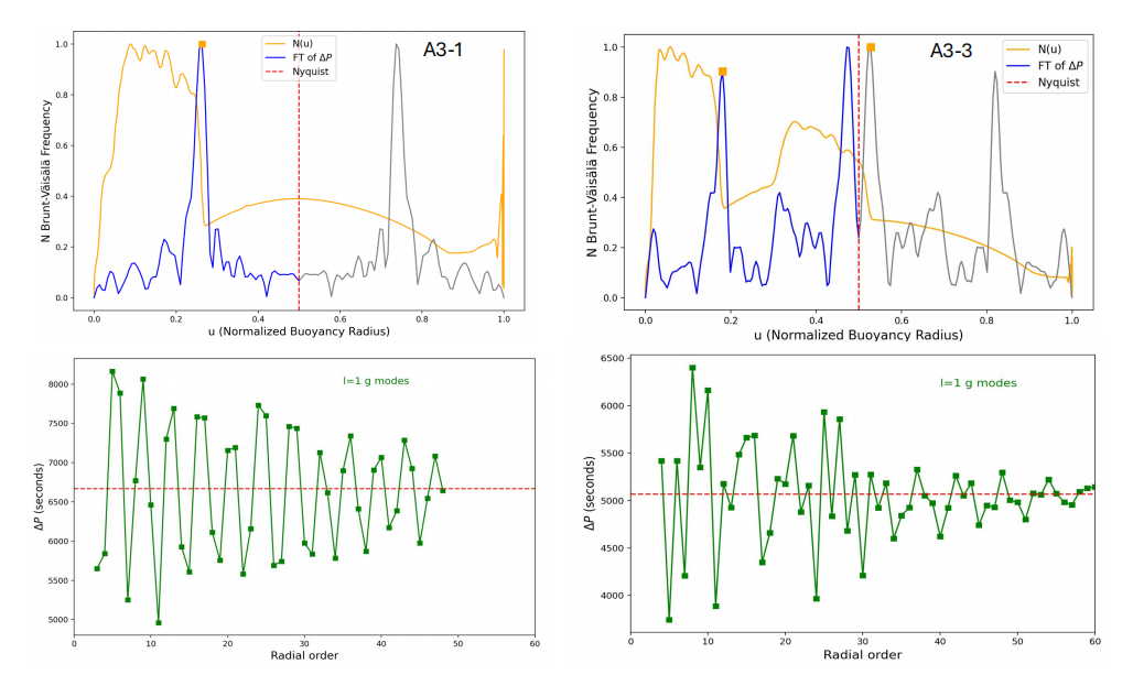 Figure 3: Period spacing changes (lower panels) and period spacing frequency analysis results (upper panels: blue markers + gray solid lines) of the star before (left panel) and after (right panel) rapid mass loss. In the upper panels, the yellow solid line represents the buoyancy frequency, and the red dashed line represents the Nyquist frequency. Image by WU.